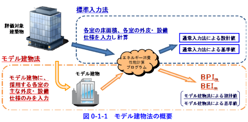 モデル建物法は、スピーディーに計算結果を得たいときに選ばれる方法です。建物用途ごとに設定されたモデル建物に対し、評価したい建築物の外皮や設備仕様を入力し、結果を得ます。モデル建物は国が過去の実績から設定しています。