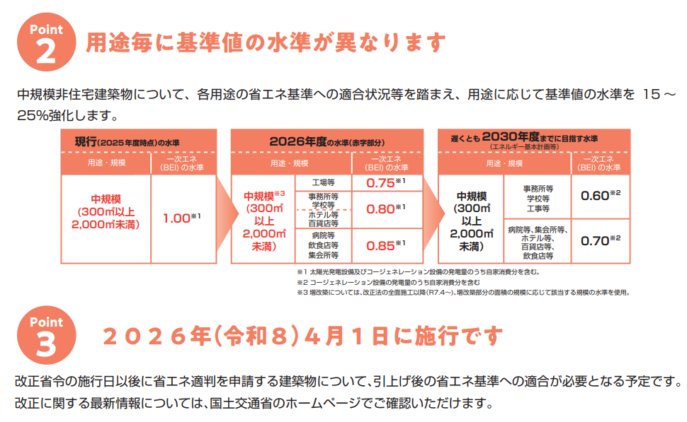 2025年4月施行の省エネ基準適合義務化に続き、2026年4月以降も省エネ基準の引き上げが予定されています。延床300㎡以上2,000㎡未満の中規模非住宅では、用途に応じて省エネ基準が段階的に強化(目安として15〜25%程度)されます。
