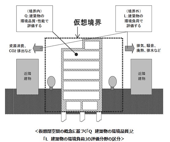 CASBEEは敷地境界線を「仮想閉空間」と定義し、「建築物の環境品質(Q)」と「建築物の環境負荷(L)」の2つの要因をそれぞれ区別して評価します。