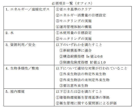 | 資源・マテリアル | ・水資源の保護・非再生性資源の使用量削減・汚物物質含有材料の使用回避 |