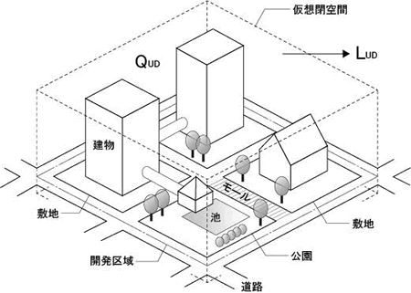 CASBEE街区は、評価したい建築物を含む一帯に仮想境界を設け、境界内部の環境品質や外部に向けての環境負荷を評価します。