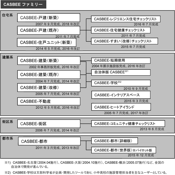 CASBEEは、戸建住宅から街区や都市まで幅広く網羅します。CASBEEの対象建築物は「CASBEEファミリー」と呼ばれ、建築物の種類に合った評価項目が用意されています。