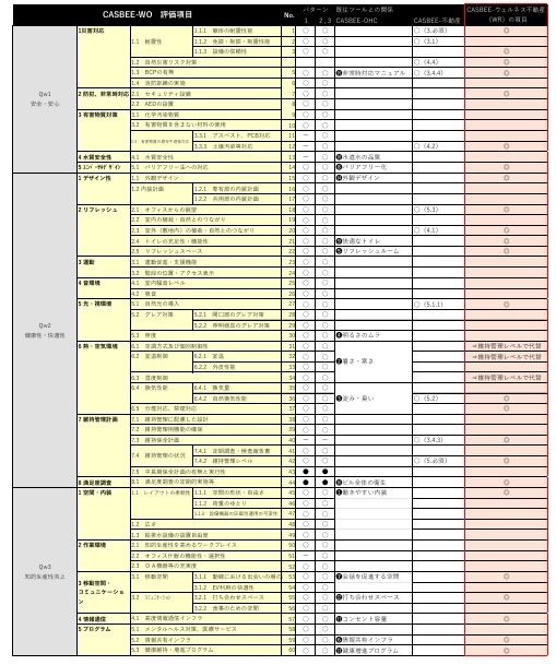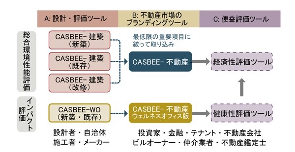 CASBEEウェルネスオフィスの評価ツールを主軸に、CASBEE不動産の経済性評価項目の重要項目のみを組み合わせて開発されています。