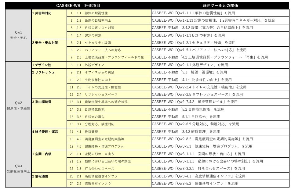 CASBEEウェルネスオフィスとCASBEE不動産から、安心・安全に働くために不可欠な耐震性能やセキュリティ設備、そして健康で快適に過ごすために必要な環境性能を評価する項目を厳選しています。