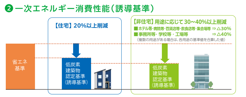 | 一次エネルギー消費量性能 | 省エネ基準比で20%以上削減 | 用途別に30~40%以上削減 |