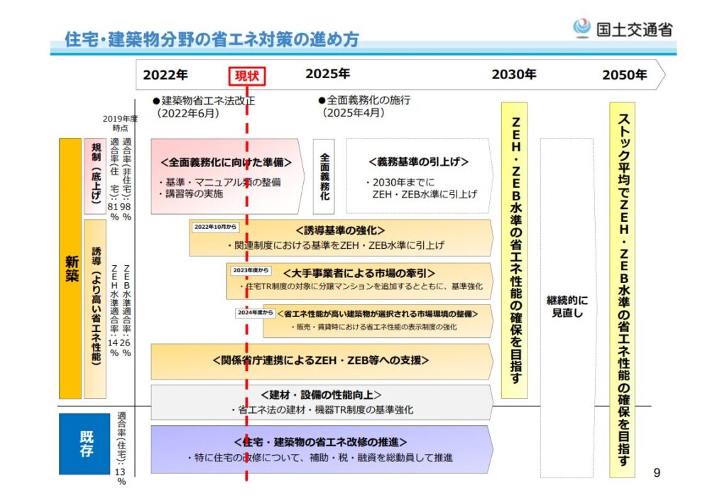 建築分野の省エネ対策を推進するため、政府は急ピッチで建築物のZEB・ZEH化を進めています。政府方針として、2030年度以降に新築される住宅・建築物で、ZEH・ZEB水準の省エネ性能確保を目指す方向性が示されています。