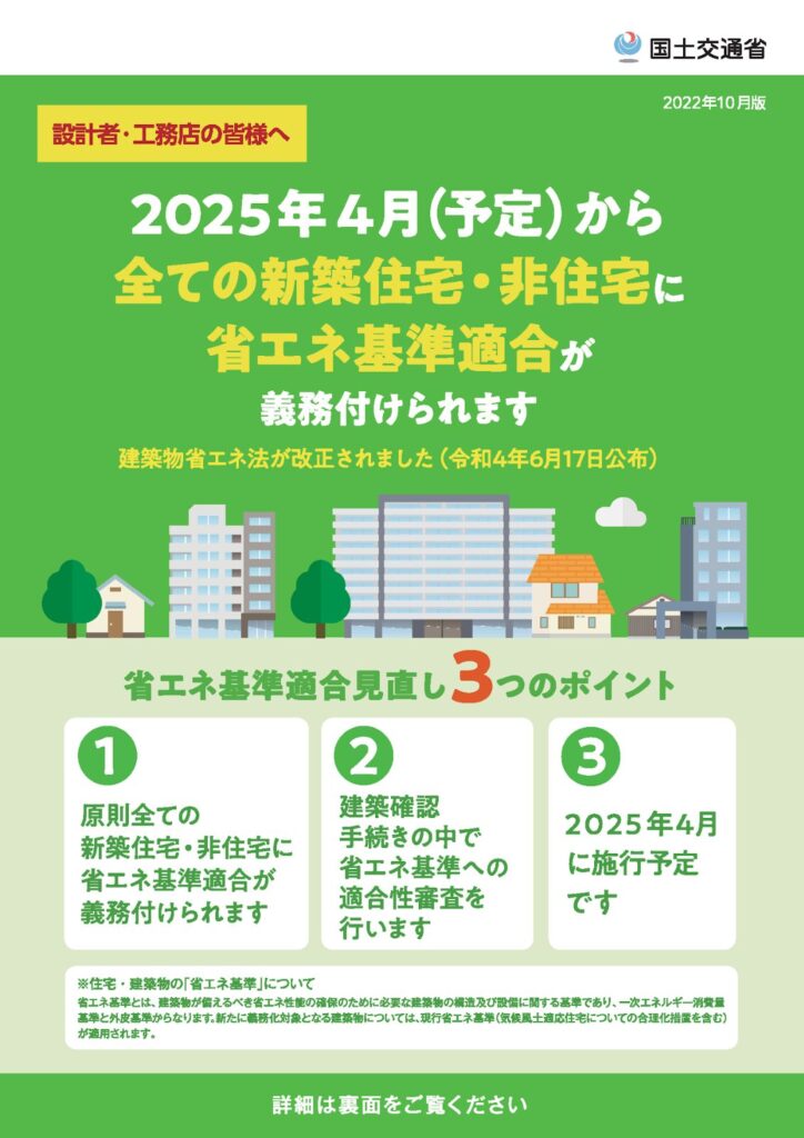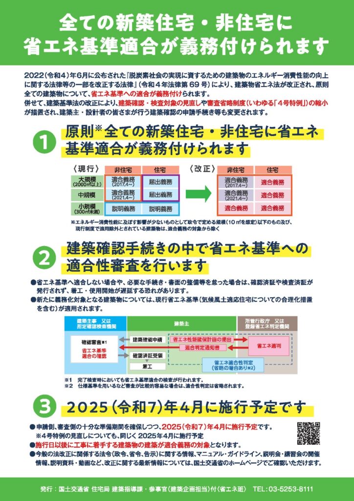 省エネ基準適合は原則義務ですが、省エネ適判の要否や審査の簡素化(仕様基準等)は、建築物の条件・確認手続と連動します。