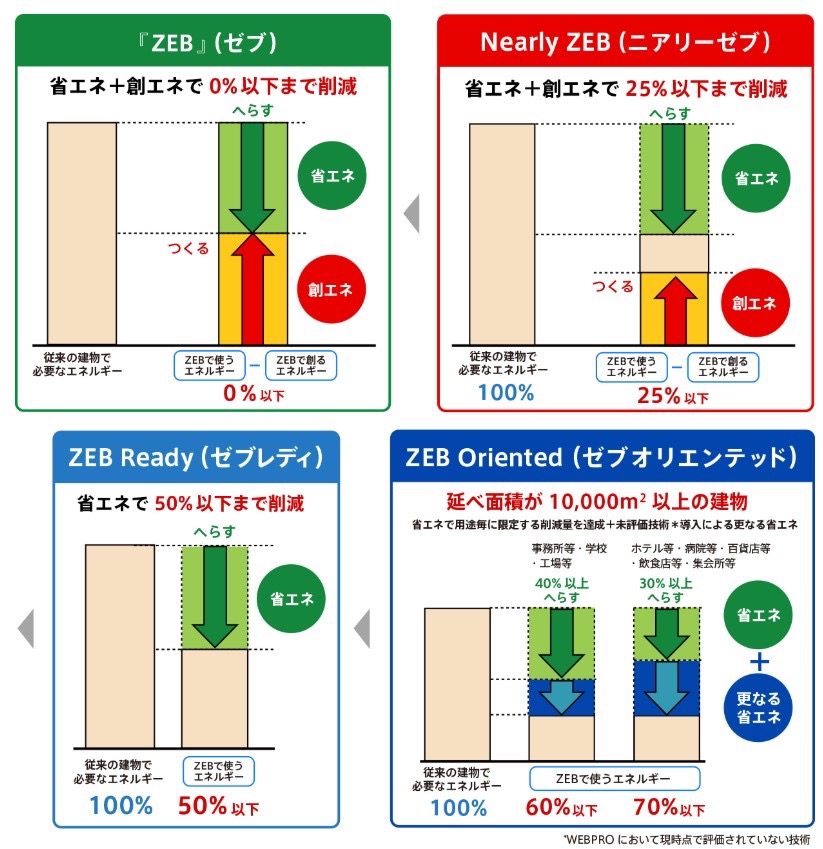 ZEBとは、建築物で消費するエネルギーを省エネと創エネを組み合わせることで実質ゼロにするのを目指す制度です。
