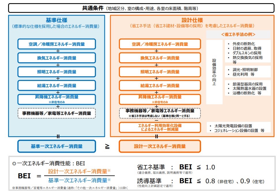 BEIとは、実際に建てる建築物の設計一次エネルギー消費量を建築用途や地域などの条件によって定められる基準一次エネルギーで除した値で、数値が小さいほど省エネ性能が高いと評価されます。